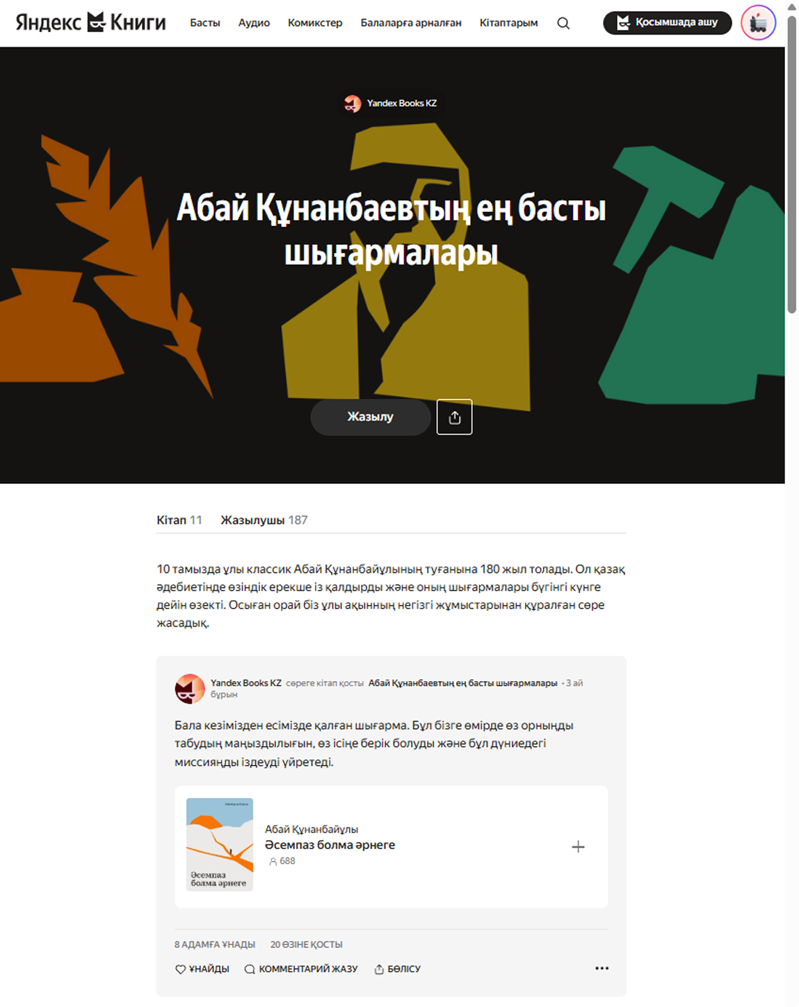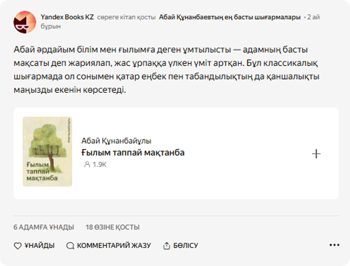 Подготовить спецпроект ко 180-летию Абая Кунанбаева совместно с Яндекс Книгами, чтобы вернуть голос великого мыслителя в городскую повседневность.