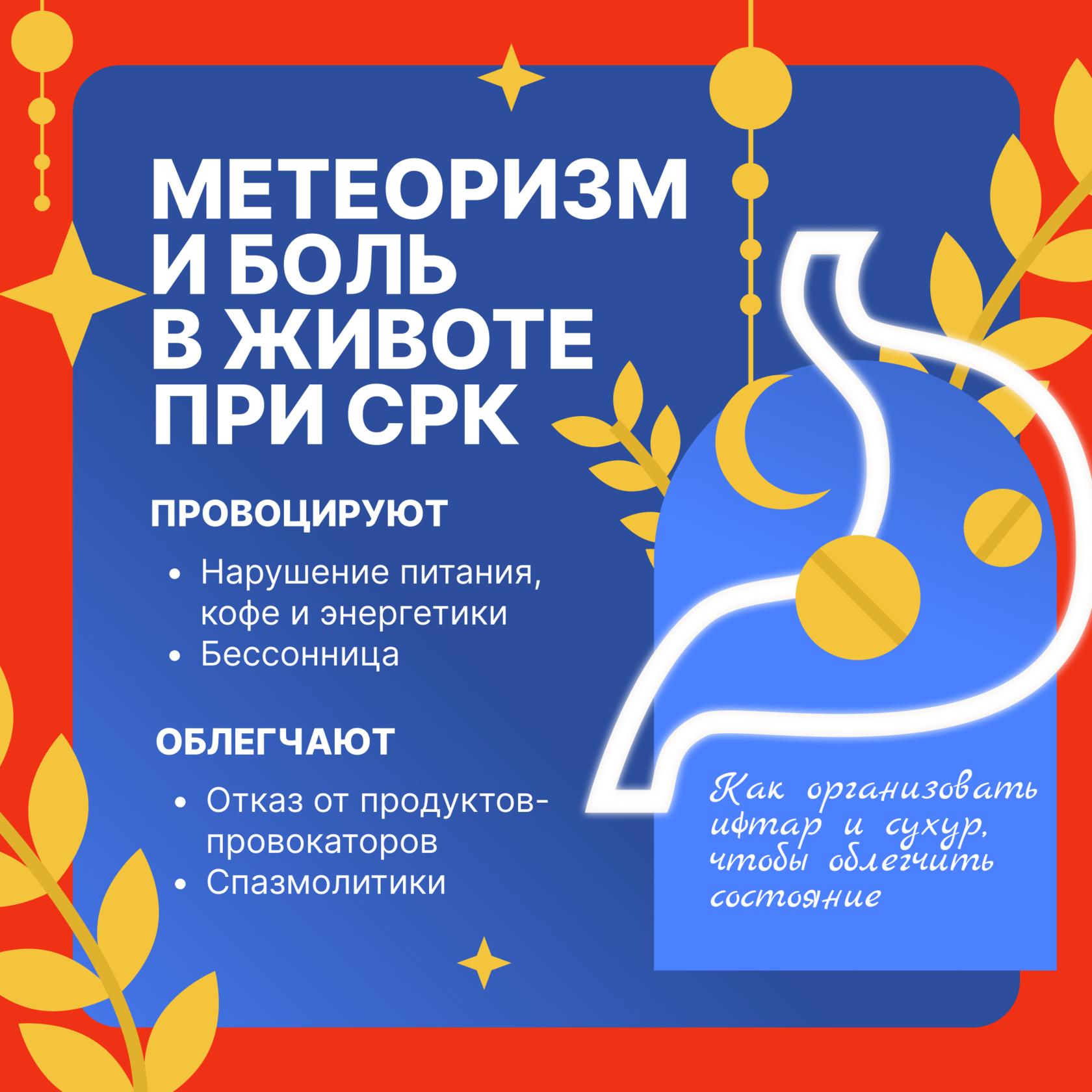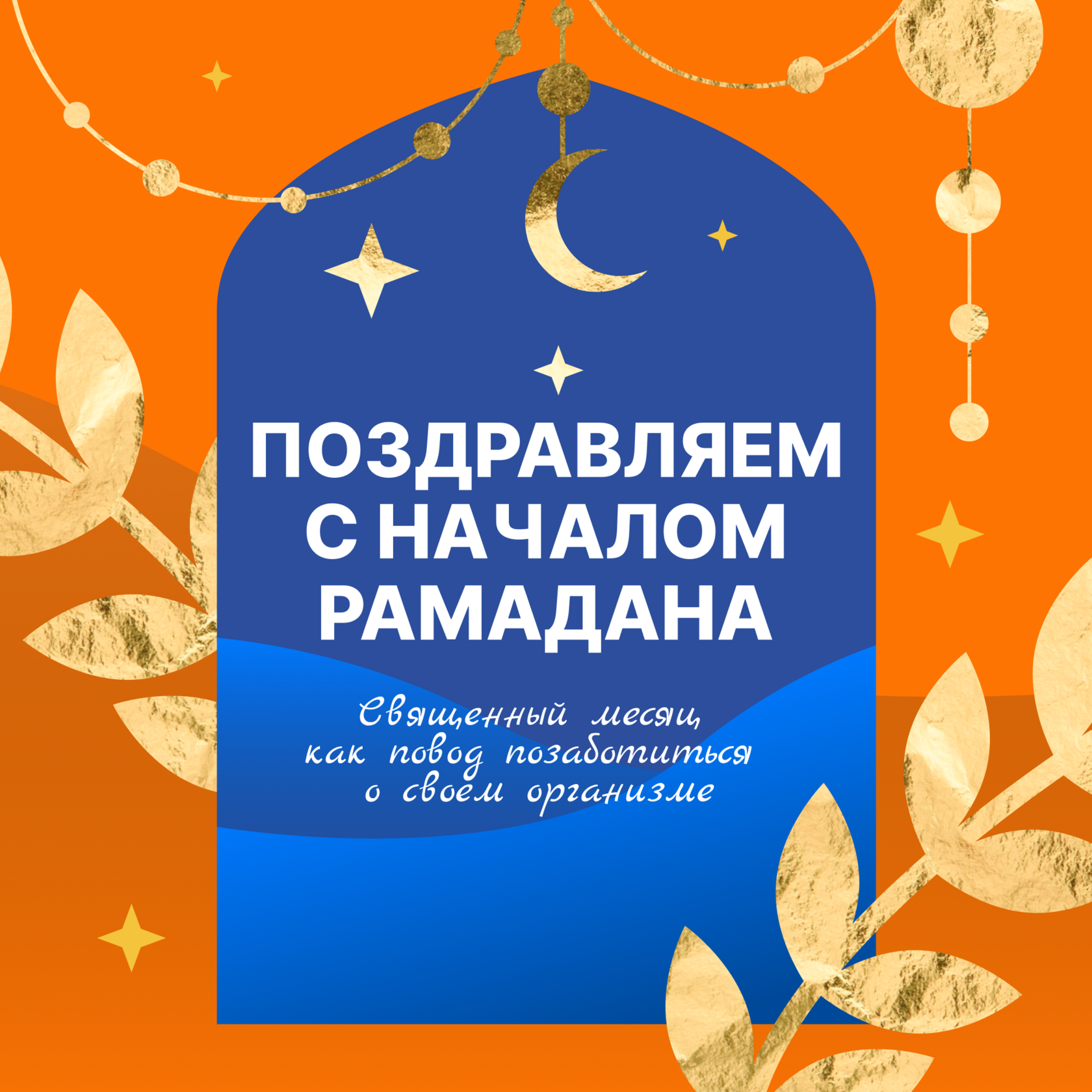 Креативная рамка вдохновленная тем, что получает каждый житель СНГ на праздники — открытками в WhatsApp. Но, мы не просто поздравляли с Рамаданом, а рассказывали, как поддержать организм в этот важный, но стрессовый для ЖКТ месяц.